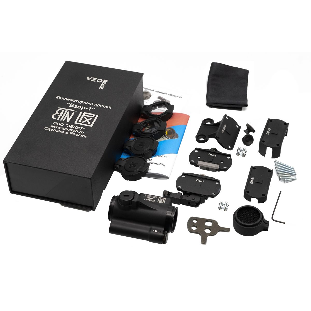 Коллиматорный прицел «Взор-1» с установленной быстросъемной платформой ПБ-1 и элементом питания - 1; Проставка ПВ-30 - 1; Проставка ПВ-39 - 1; Платформа низкопрофильная ПН-1 - 1; Платформа установочная ПВ-Б45У - 1; Защитные крышки для линз - 4; Салфетка для протирки оптики - 1; Противобликовая бленда - 1; Руководство по эксплуатации - 1; Краткое руководство по эксплуатации - 1; Упаковка – металлический короб - 1.