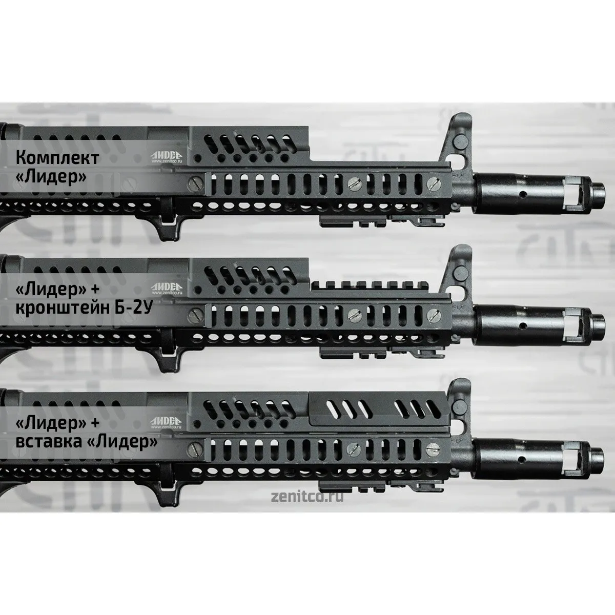 Комплект «Лидер» предназначен для установки на место штатного цевья АК и карабинов на его основе с длиной ствола не менее 415 мм (несовместим с короткими версиями).