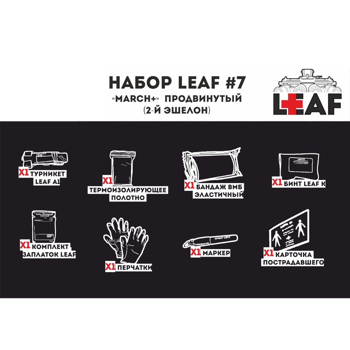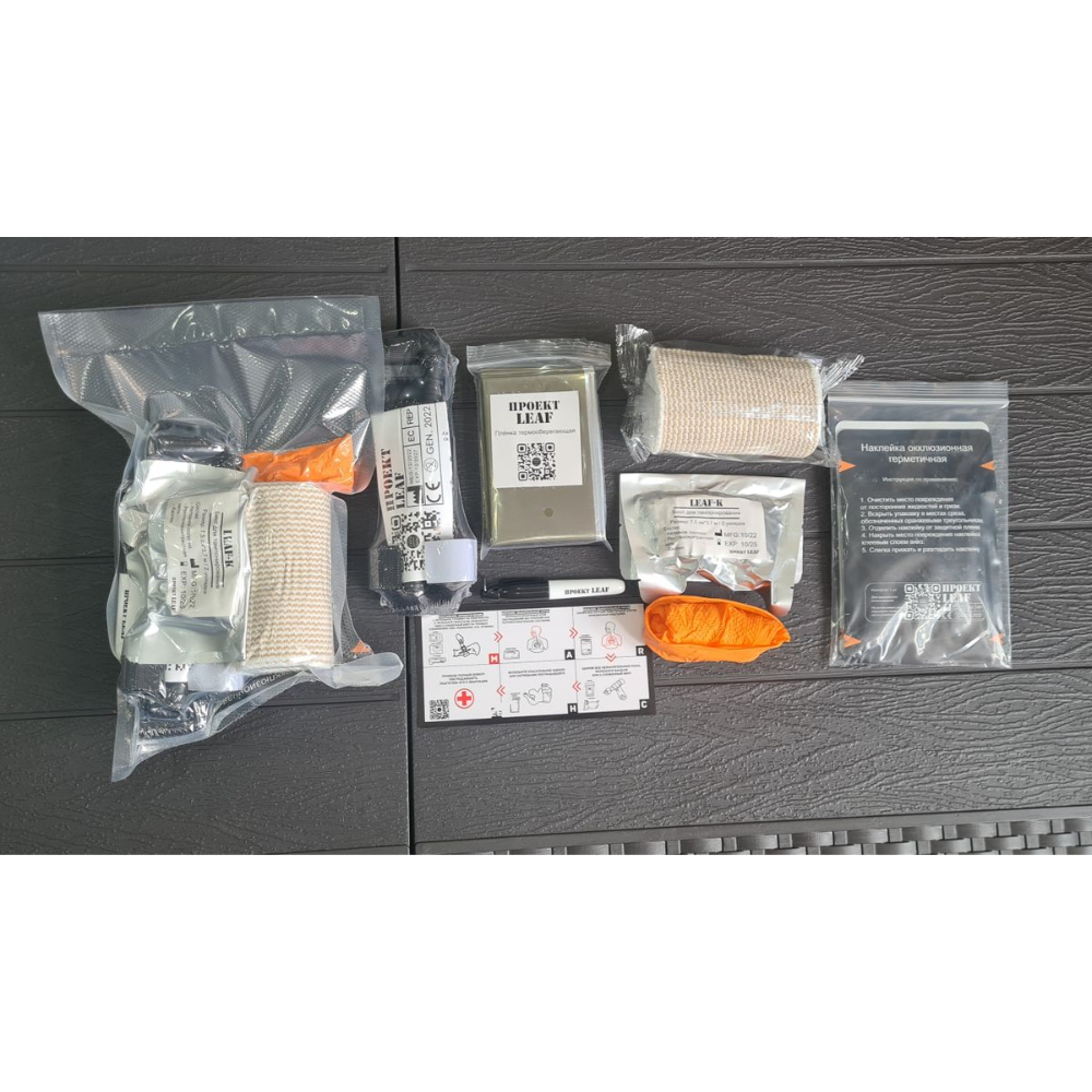 Турникет LEAF A1 черный - 1 шт; Комплект заплаток LEAF - 1 шт; Термоизолирующее полотно LEAF - 1 шт; Перчатки - 1 пара, Бандаж; ВМБ эластичный - 1 шт; Маркер LEAF - 1 шт; Бинт для тампонирования LEAF-K - 1 шт; Карточка пострадавшего - 1 шт.