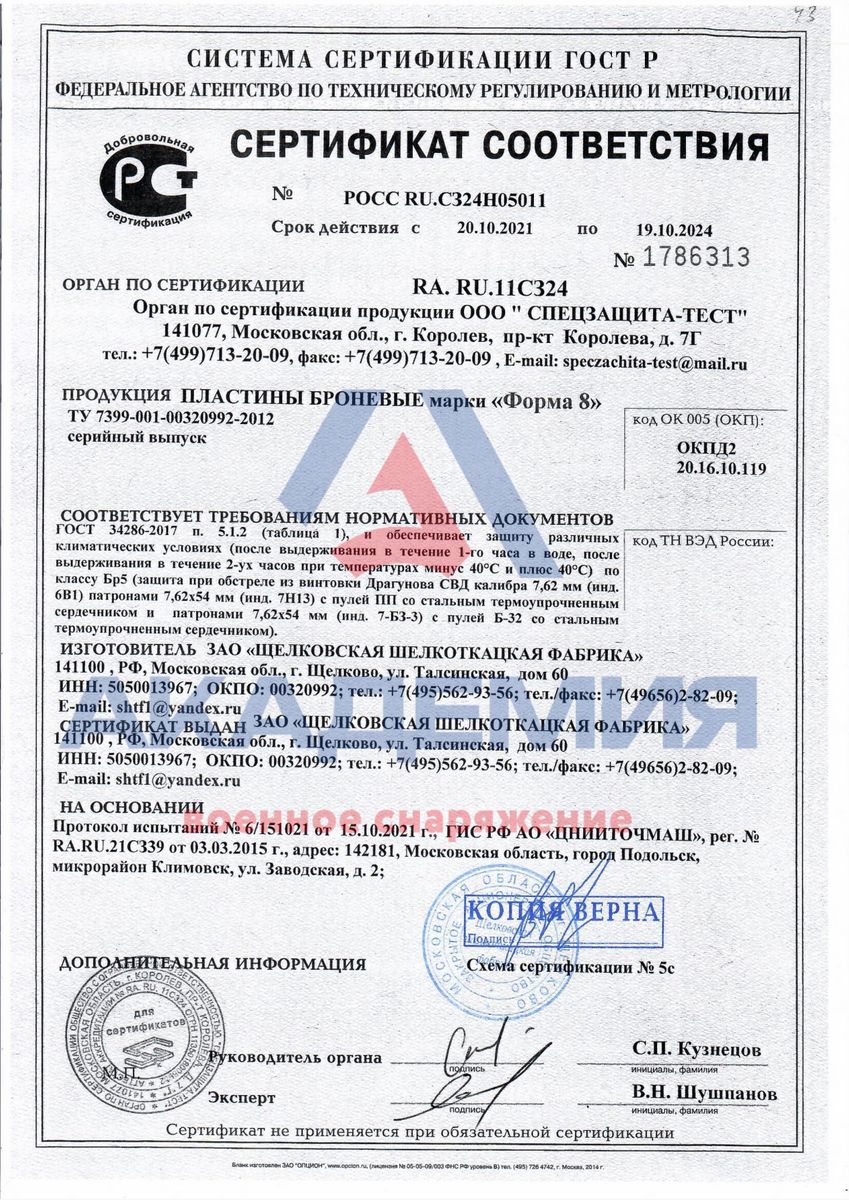 Класс защиты обеспечивается при использовании с мягким баллистическим пакетом за плитой.