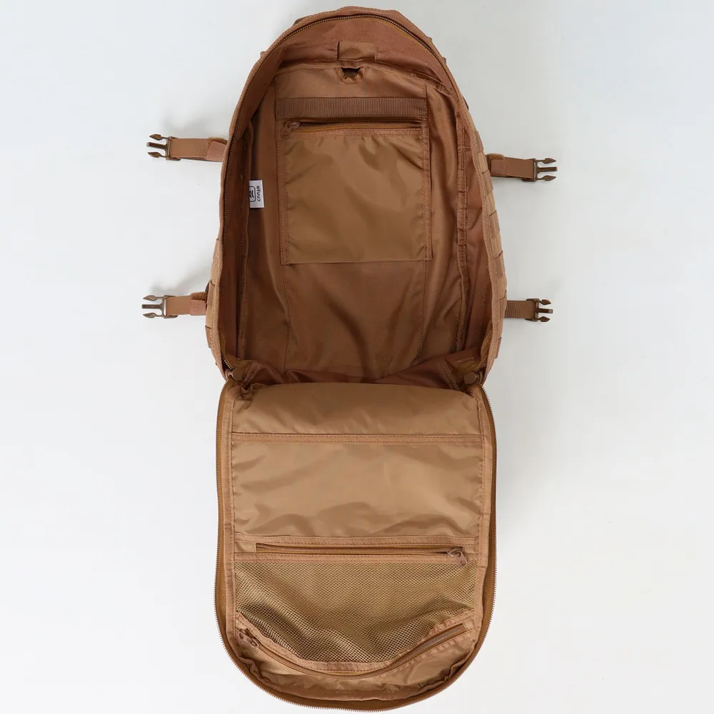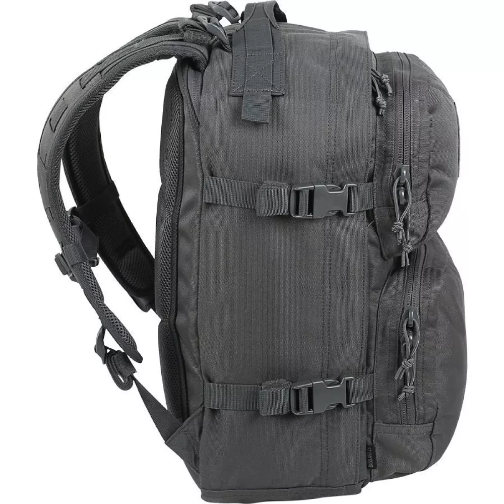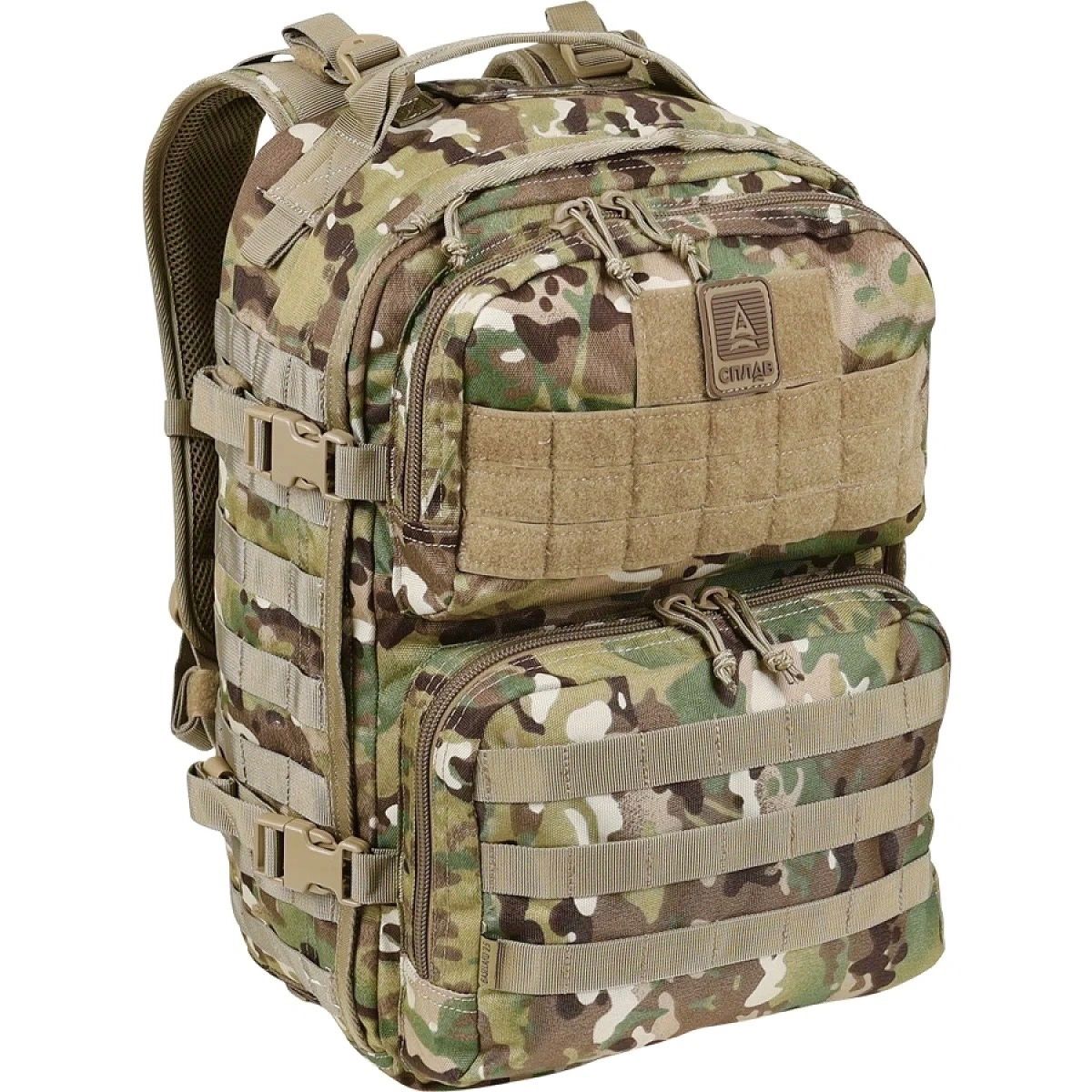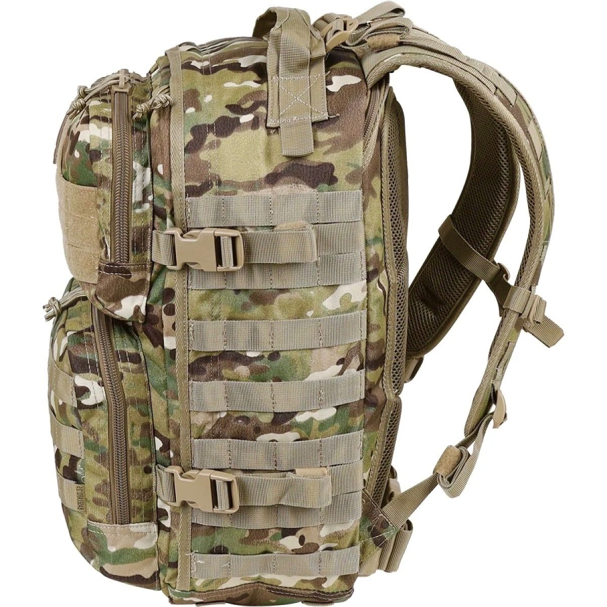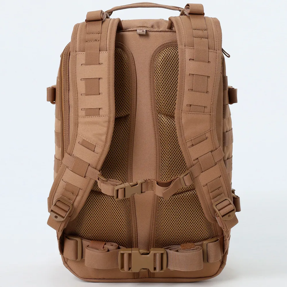 Вся свободная внешняя площадь ранца обшита стропами PALS. Съемный пояс из 38 мм стропы. Утяжки с фастексами на боках ранца.