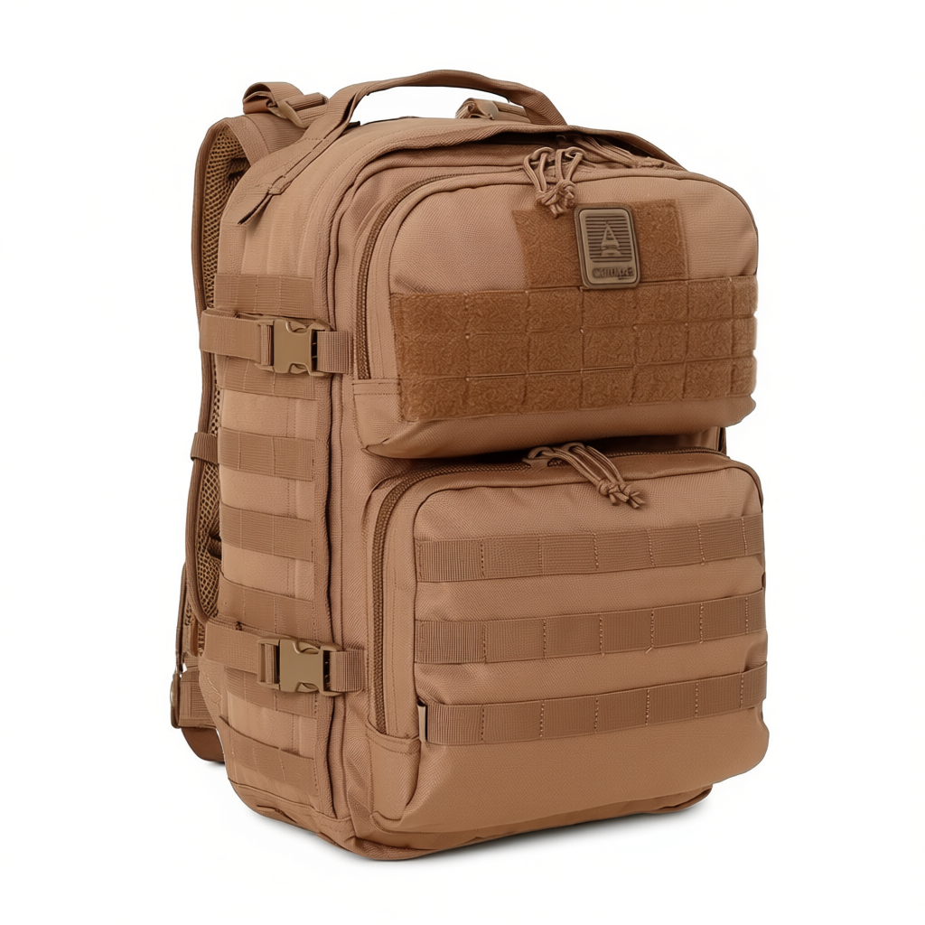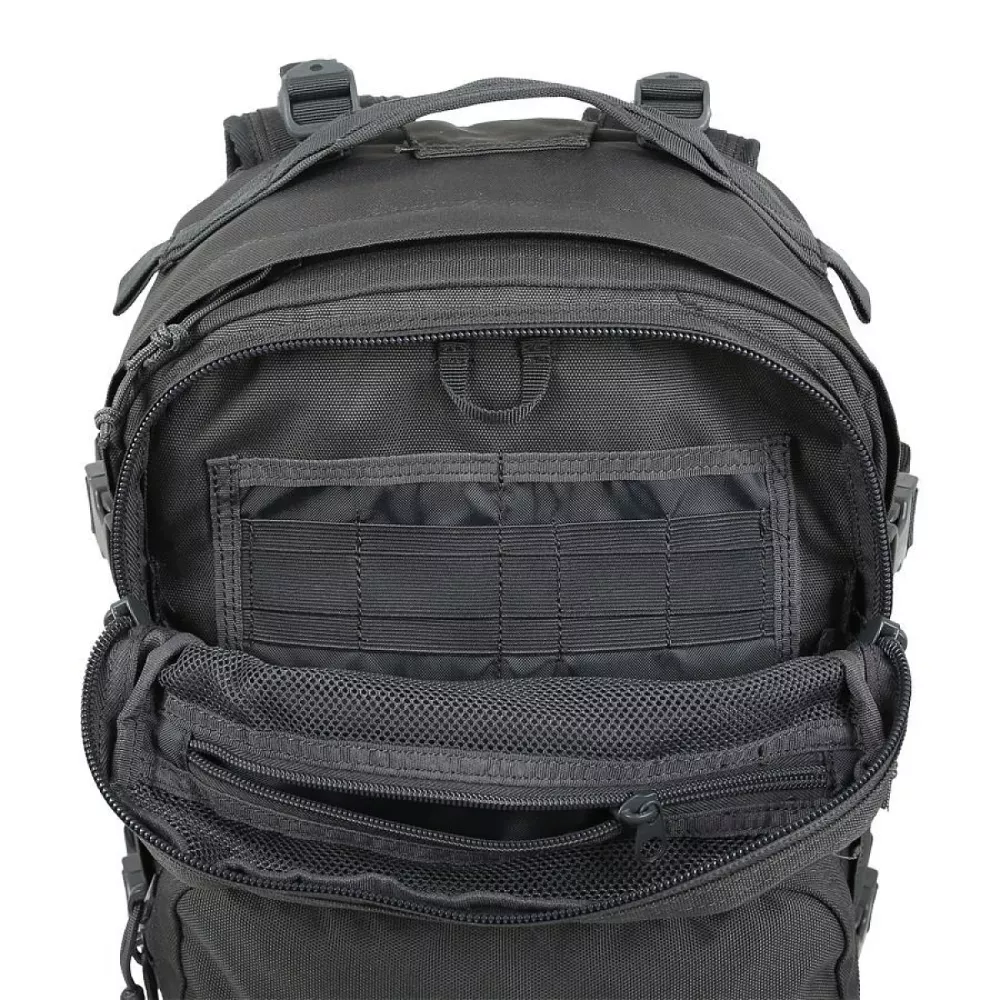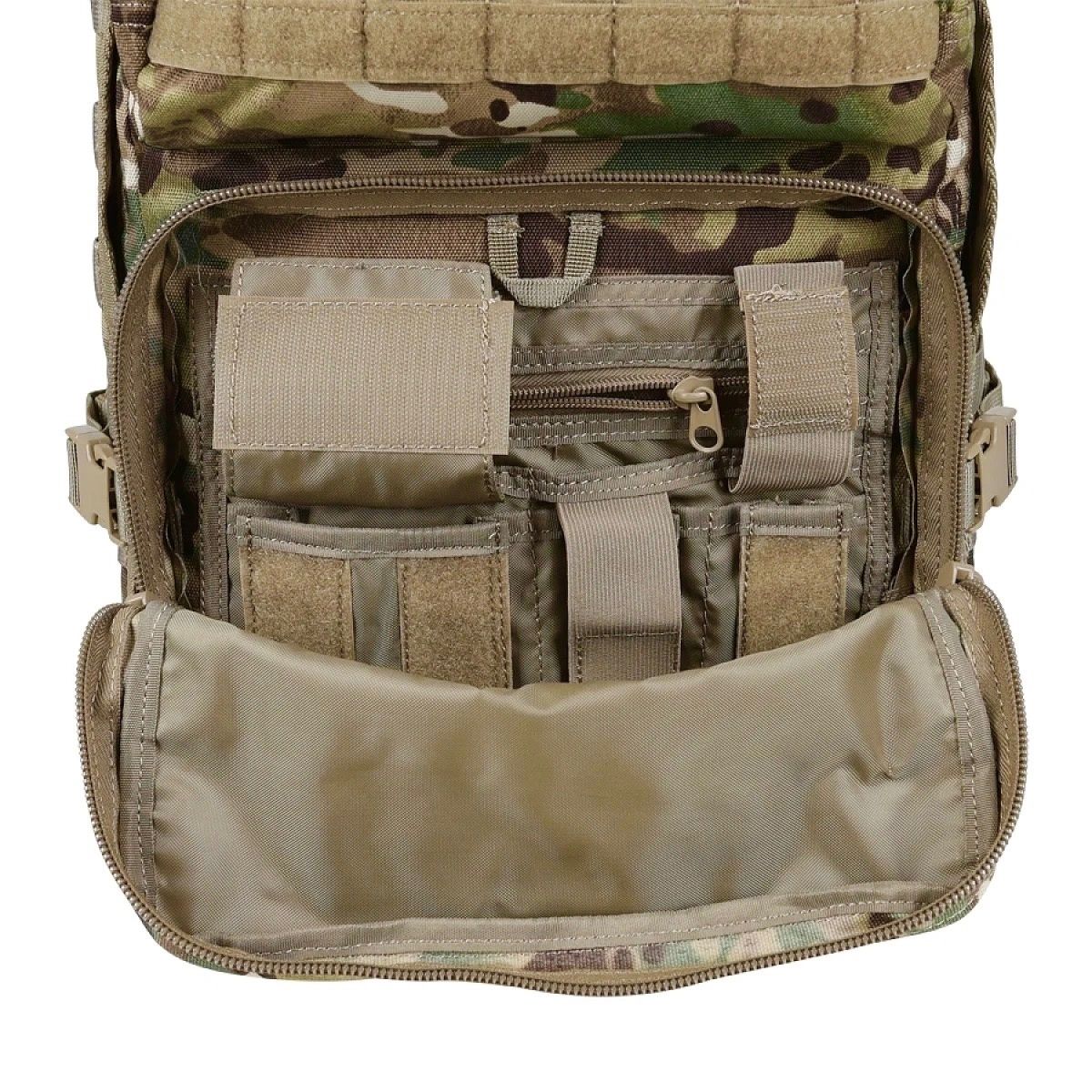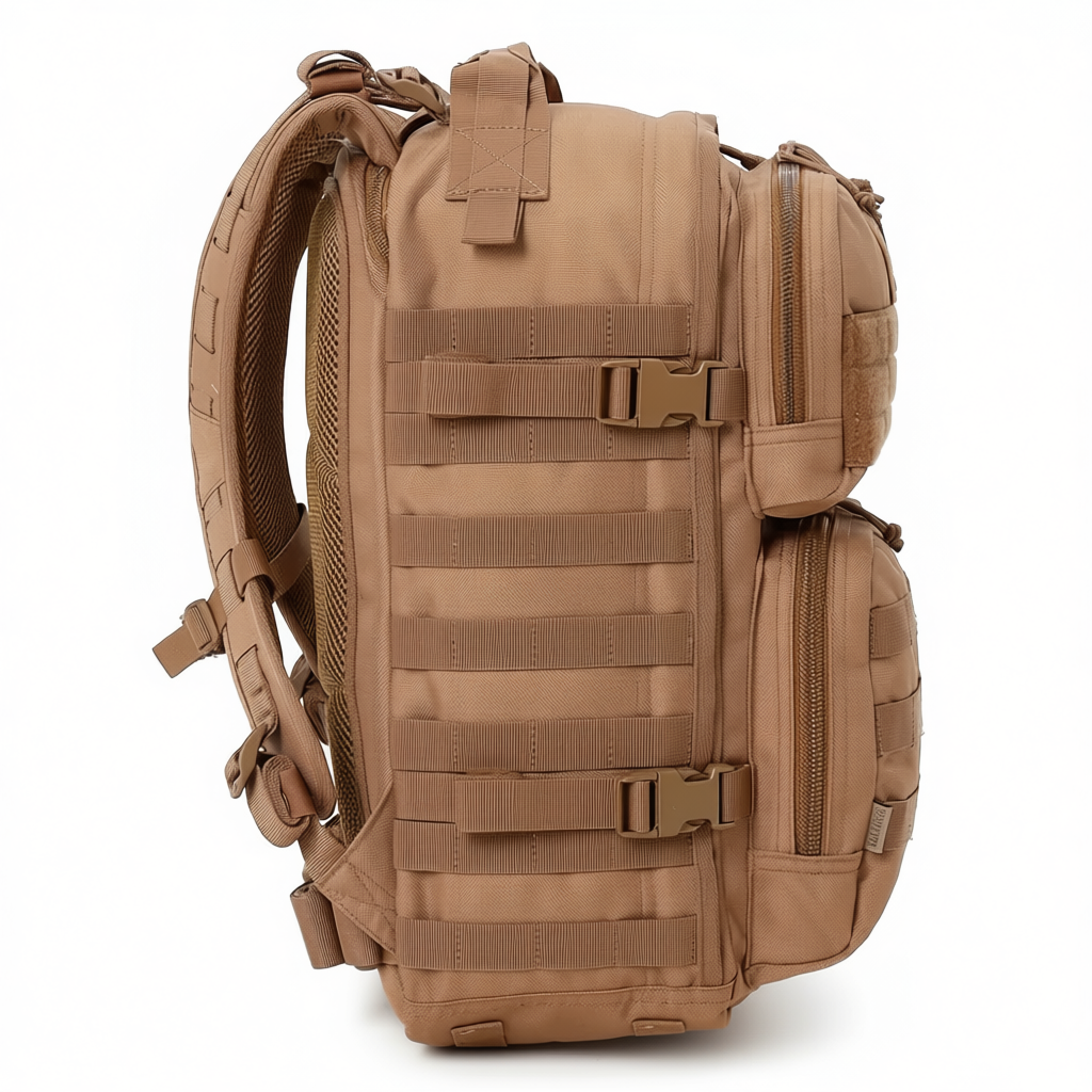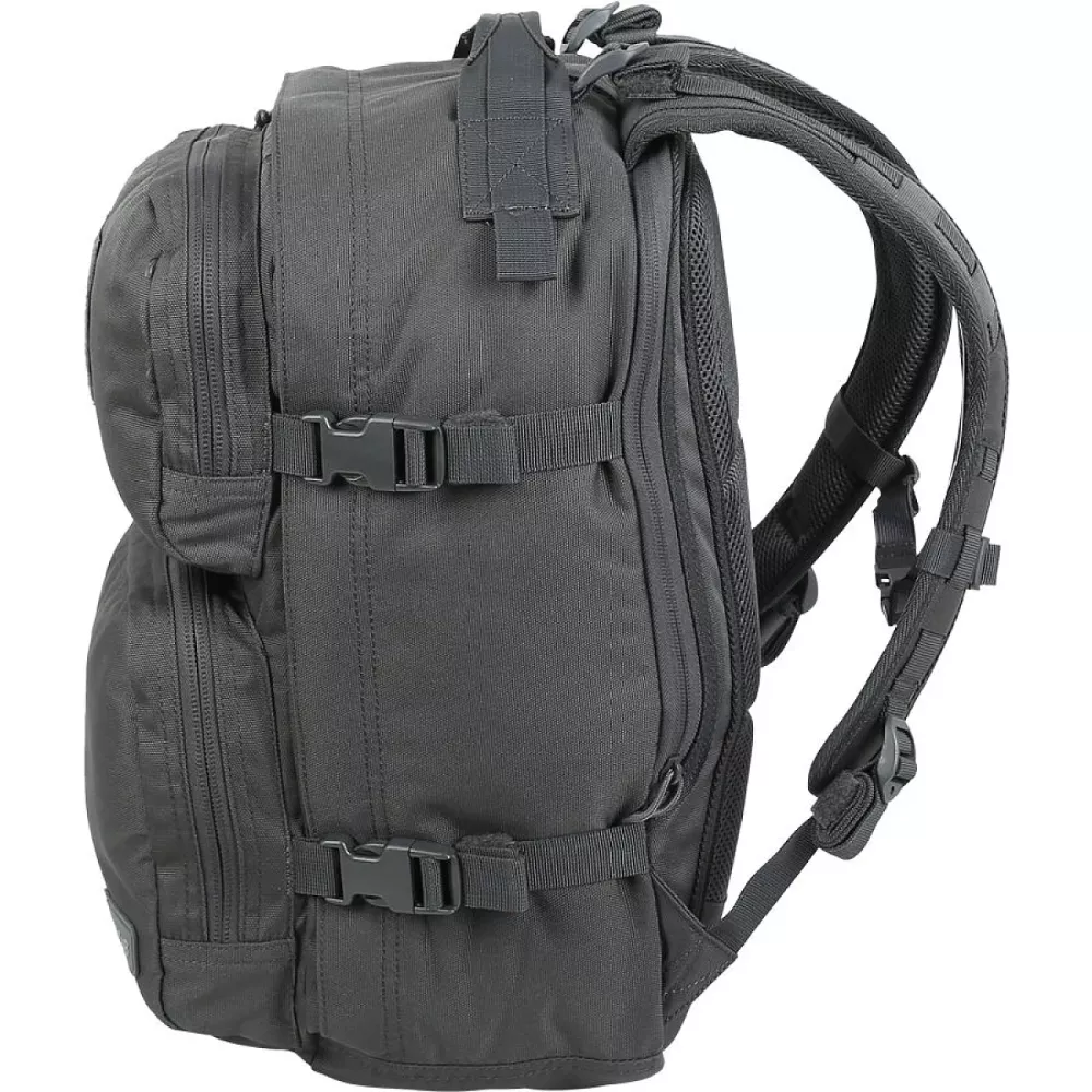 Вся свободная внешняя площадь ранца обшита стропами PALS. Съемный пояс из 38 мм стропы. Утяжки с фастексами на боках ранца.