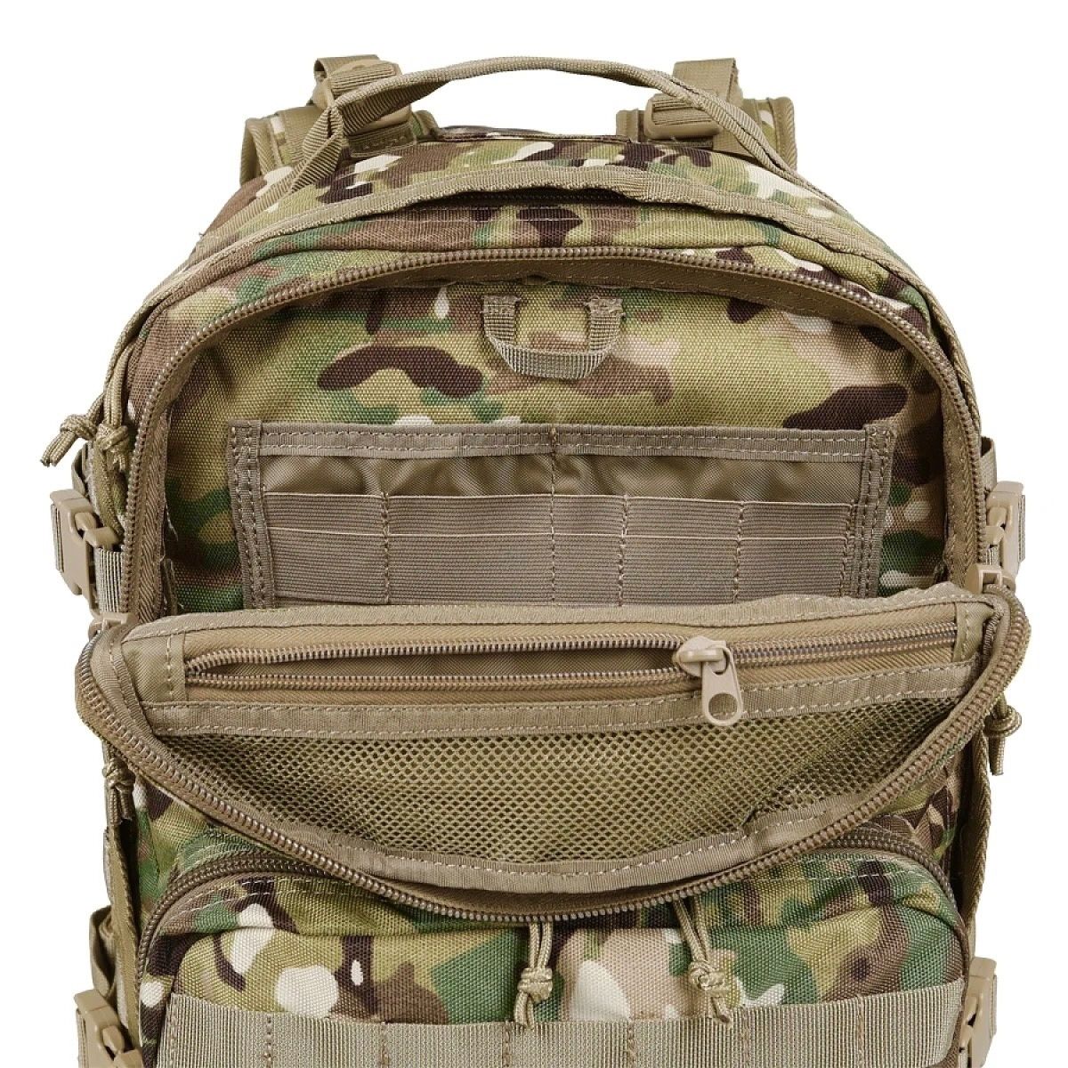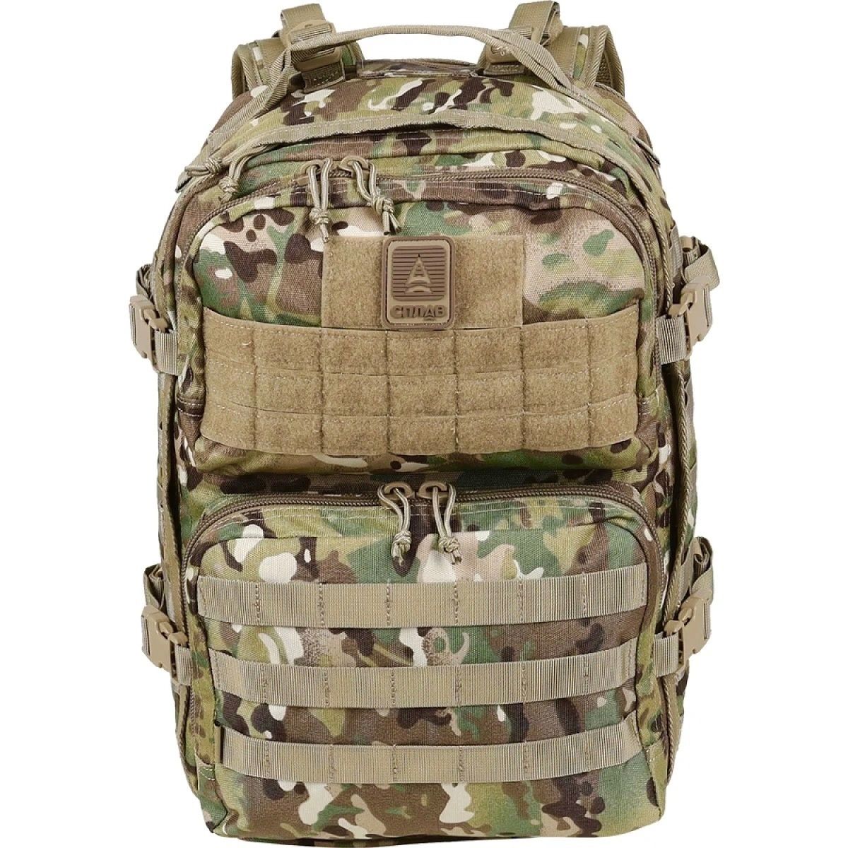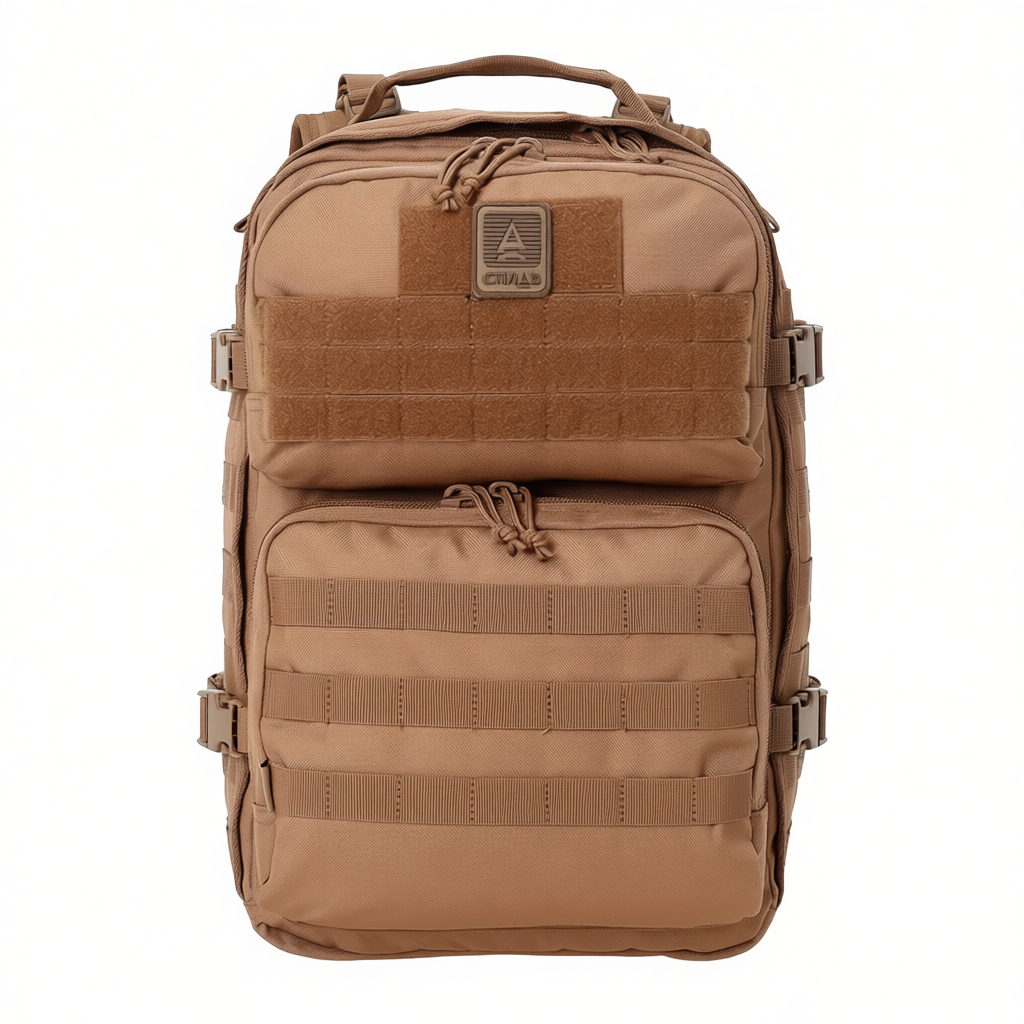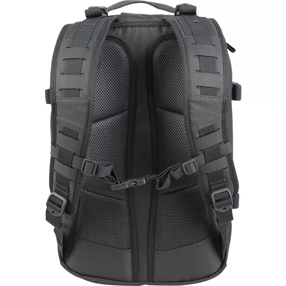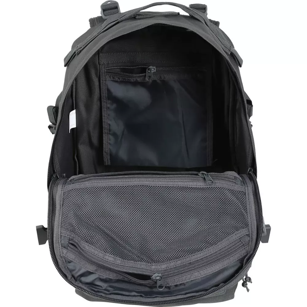 Вся свободная внешняя площадь ранца обшита стропами PALS. Съемный пояс из 38 мм стропы. Утяжки с фастексами на боках ранца.