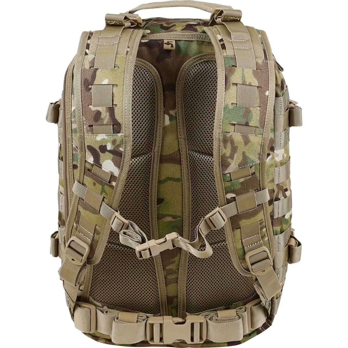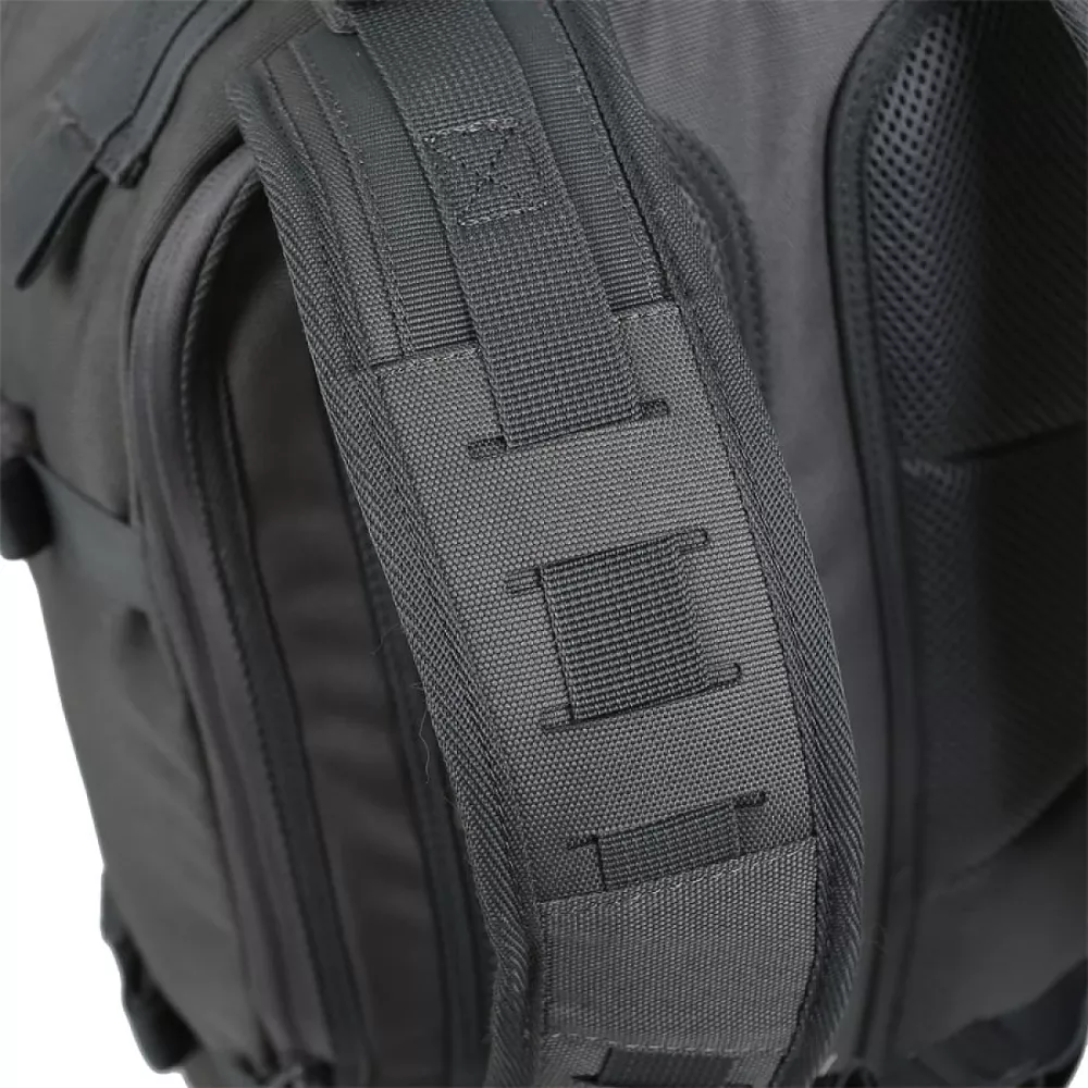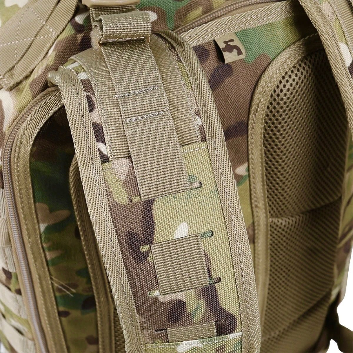 Несъемные лямки с анатомическим силуэтом. Два слоя пены и сетка Airmesh для мягкости и вентиляции. Верхние оттяжки. Ячейки PALS для крепления подсумков выполнены методом лазерной резки в усиленной ткани, что обеспечивает лямкам тонкий профиль и плоскую поверхность, не мешая прикладке оружия. В комплекте съемная грудная стяжка с подрезиненной для комфорта стропой