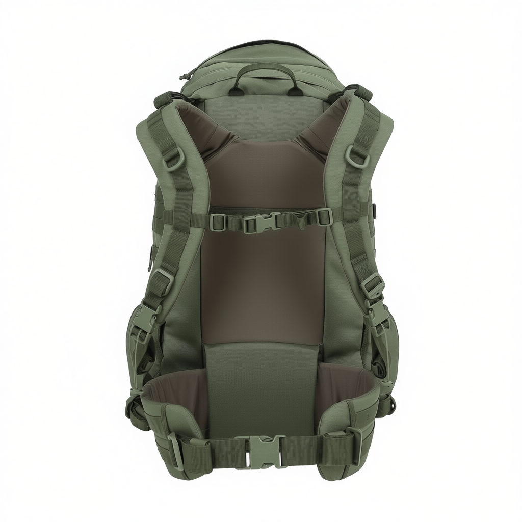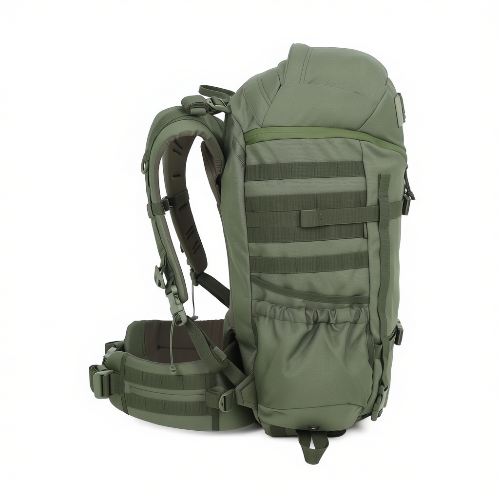 Верхняя половина боковой поверхности рюкзака обшита стропами PALS/MOLLE для крепления подсумков.