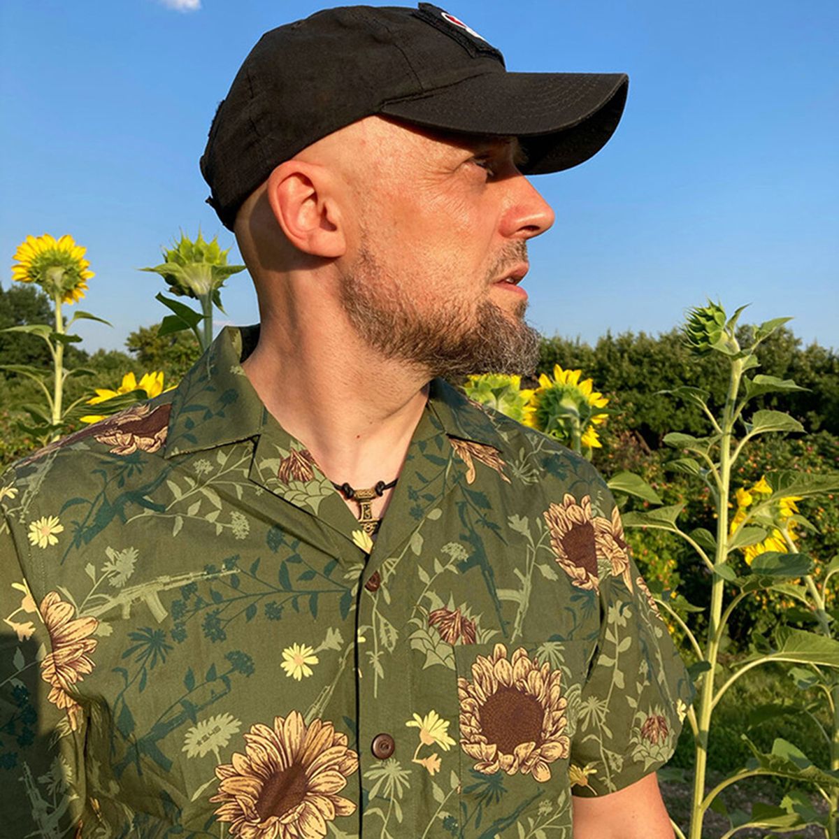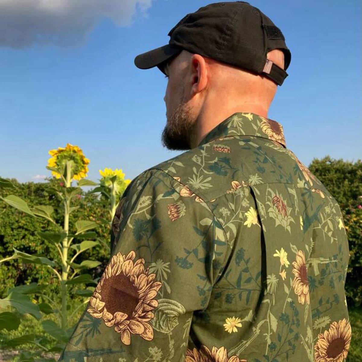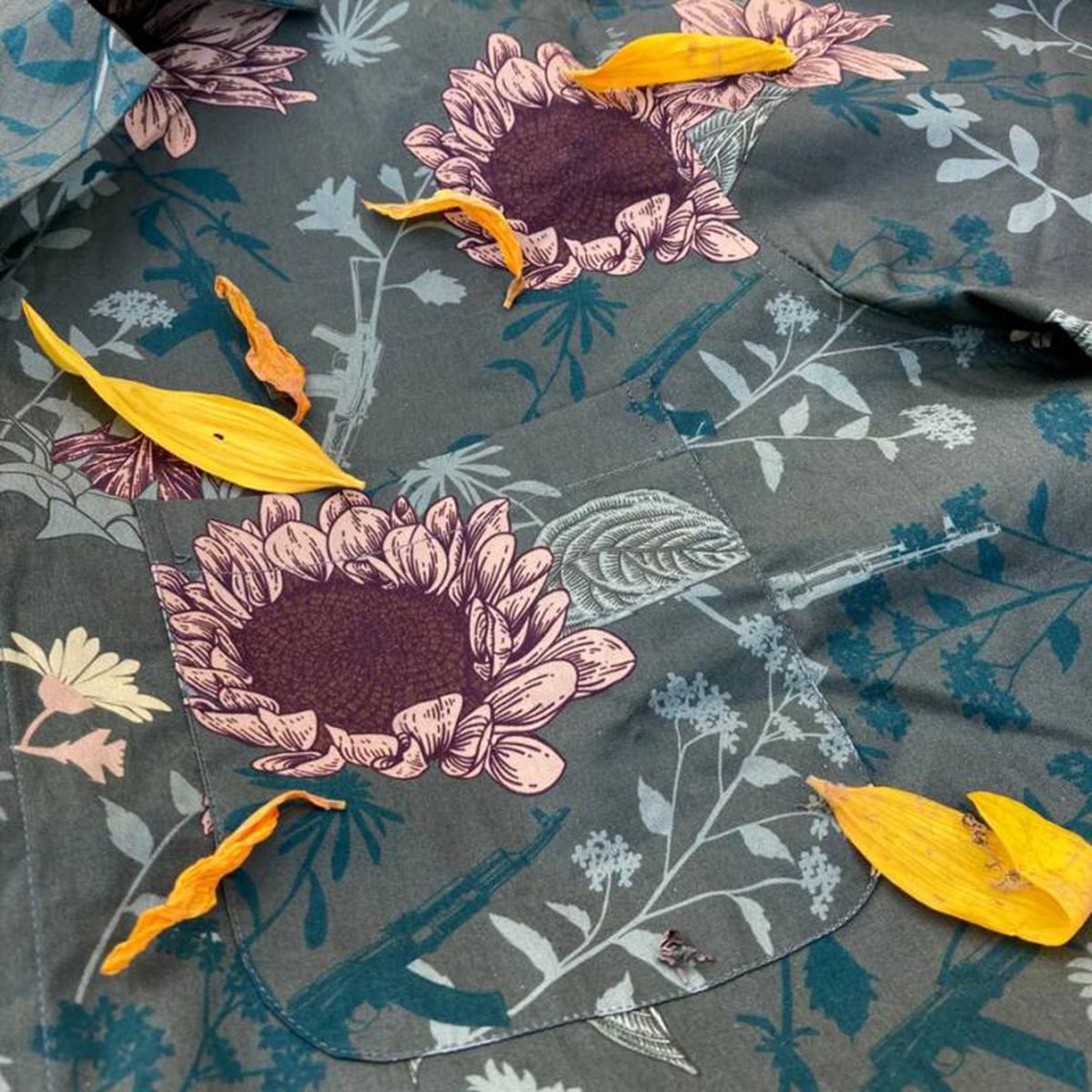 Особый дизайн рисунка, нанесенного на ткань будет интересен любителям стиля милитари, так как имеет изображение различных видов оружия, перемежающихся с изображением подсолнухов.