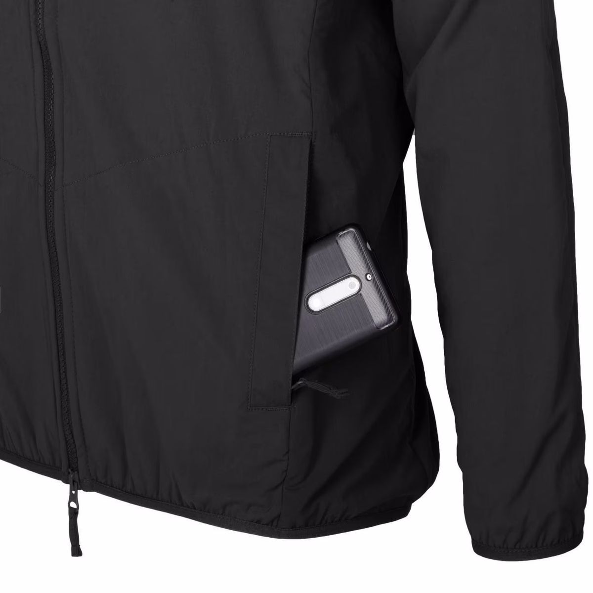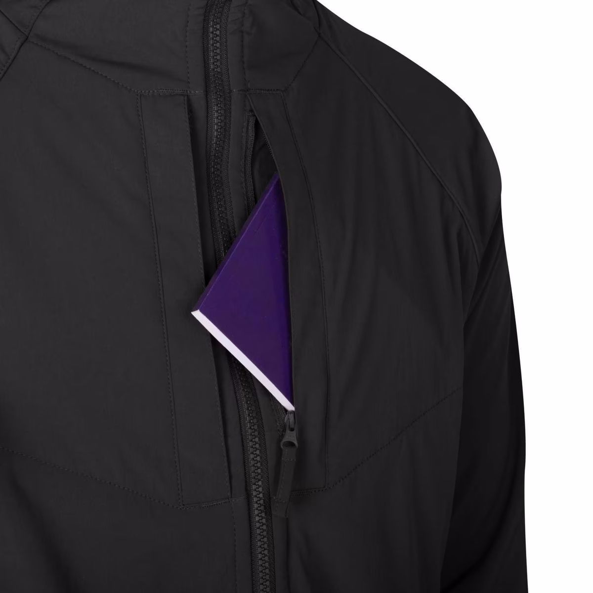 Четыре кармана на молнии позволяют равномерно распределять предметы повседневного ношения, в то время как небольшой размер позволяет носить куртку в рюкзаке.